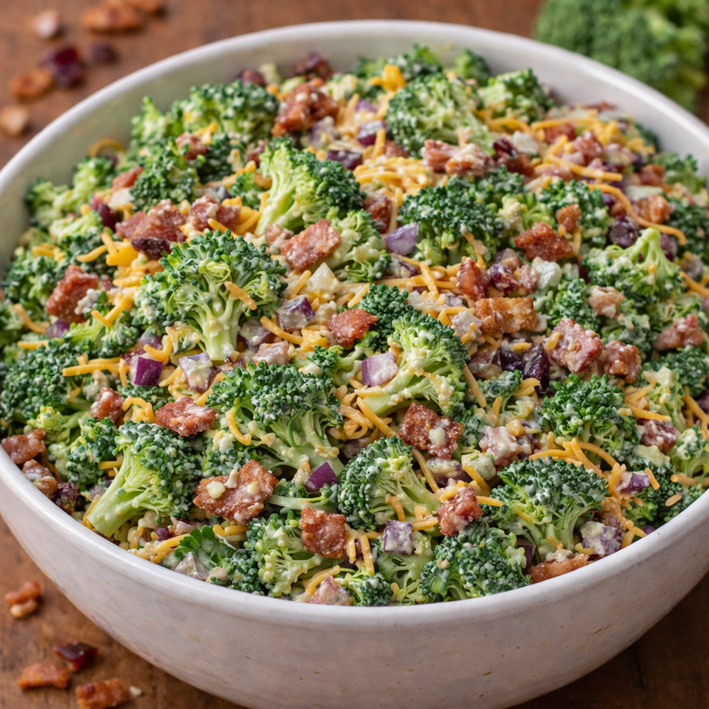 Serve immediately, or cover and refrigerate for 30 minutes before serving. It gets noticeably better after a little time in the fridge β the broccoli softens slightly and soaks up the dressing.